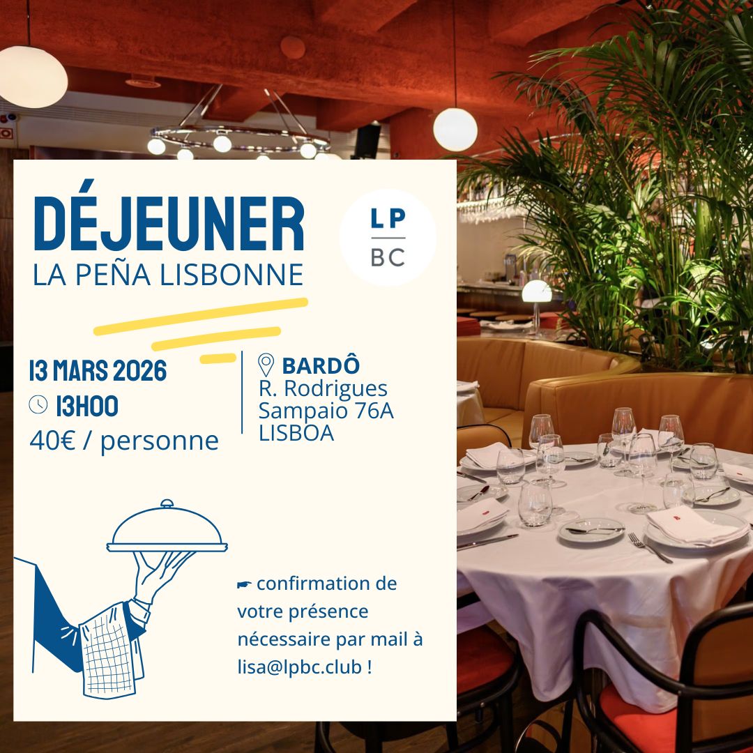 Nous avons le plaisir de vous convier au déjeuner de notre Club de Lisbonne qui aura lieu le vendredi 13 mars. Nous vous attentons à 13h au restaurant Bardô pour un nouveau moment d´échanges entre entrepreneurs. Paiement sur place, prix du repas par personne 40 euros.